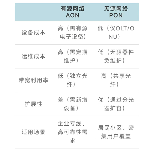 早期,主要用的是有源光网络(AON),主要采用点对点(PTP)网络架构,每个用户都有一个专用的光纤线路。AON依赖有源电子设备(如交换机、路由器、放大器)进行信号放大和分配,通过光纤实现点对点或点对多点的连接。早期应用于长途通信和核心网,后逐步延伸至接入网。然而,随着宽带用户规模爆发式增长,AON的局限性逐渐显现:有源设备需独立供电、配备专用机房,导致建设成本高昂;每新增一个用户需铺设独立光纤或增设有源节点,资源利用率低下;电子器件易受电磁干扰,故障率居高不下。